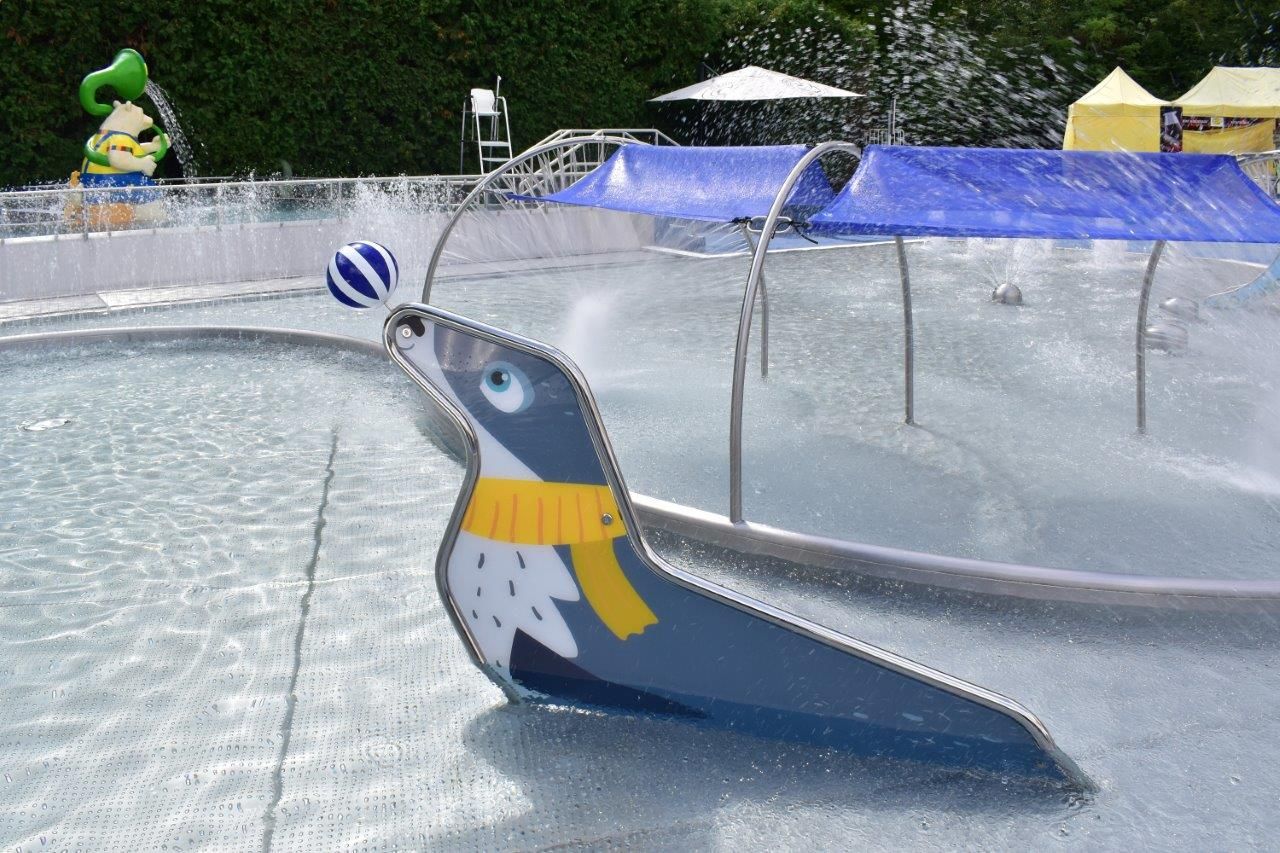 Jedná se o statickou atrakci do dětských bazénů. V tomto případě je použit vrstvený čirý akrylátový materiál opatřený barevnou folií v dělicí rovině. Akrylátový vyobrazený motiv je lemován nerezovou trubkou, pomocí které je konstrukce pevně ukotvena do dna bazénu. |