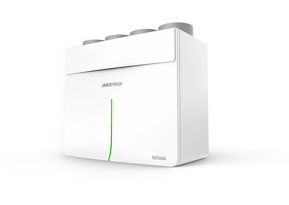 JABLOTRON FUTURA je moderní centrální rekuperační jednotka pro rodinné nízkoenergetické domy. Zajišťuje řízené větrání s vysokou účinností zpětného zisku tepla a vlhkosti, čerstvý vzduch bez zbytečných tepelných ztrát a s nízkou spotřebu energie. Nová FUTURA L+ je tišší a dosahuje ještě vyšší účinnosti rekuperace, což zvyšuje komfort a úsporu energií.