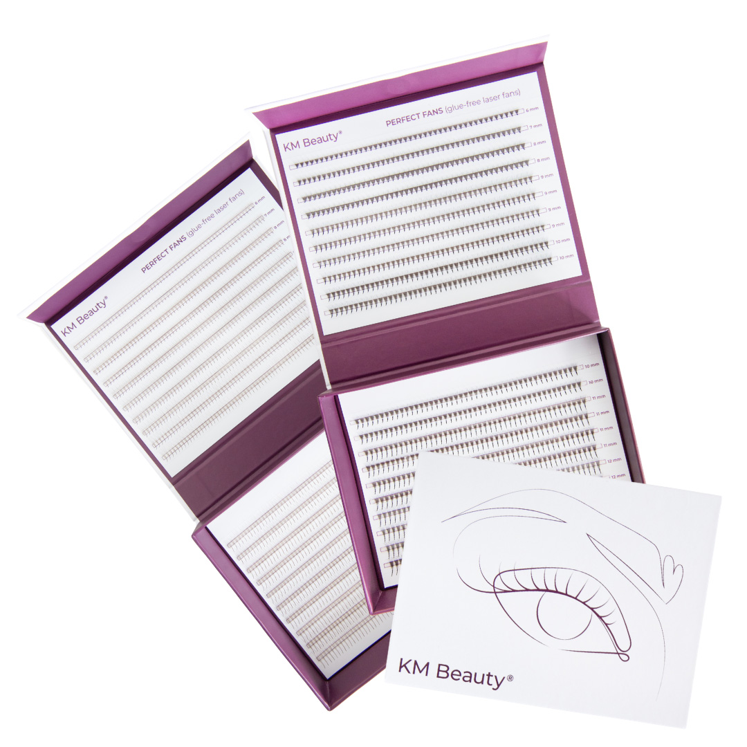 Profesionální hotové narrow vějířky KM Beauty Perfect Fans v knize vyráběné pomocí inovativní laserové technologie. Tato technologie ořezává přebytečné lepidlo a zajišťuje tak co nejtenčí nožičku bez zbytečné vrstvy lepidla (glue-free). Laserové drážky na nožičce vytváří větší plochu pro uchycení lepidla, díky čemuž spoj drží pevněji a vydrží výrazně déle. Zajišťují také čisté sety bez slepenců